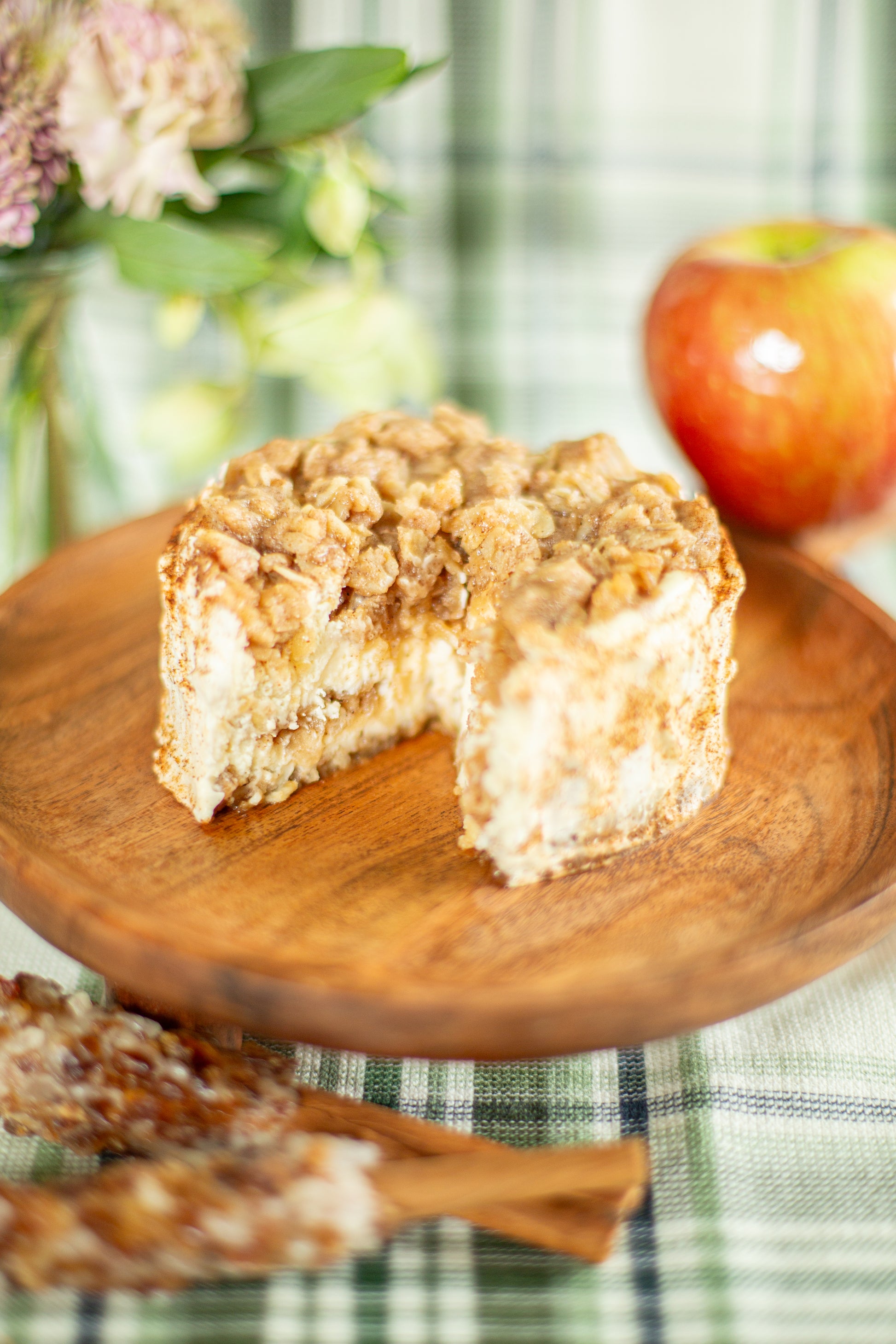 Plain cheesecake with a caramelized apple and brown sugar filling on a Belvita brown sugar cinnamon cookie crust topped with more caramelized apple and brown sugar oats!
